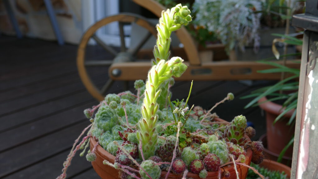 Am besten kommen in meinem Garten die fetten Hennen mit dem heißen Wetter zurecht. Sie blühen völlig unbeeindruckt vor sich hin. Die Hauswurzen sind ebenfalls Hitzekünstler, denen Wassermangel nicht schadet. Zurzeit liest man im Internet immer über die hitzeresistenten Pflanzen, die jetzt am schönsten blühen. Wie zum Beispiel Mädchenauge, Konkardenblume, Sonnenbraut, Sonnenhut und all die anderen.