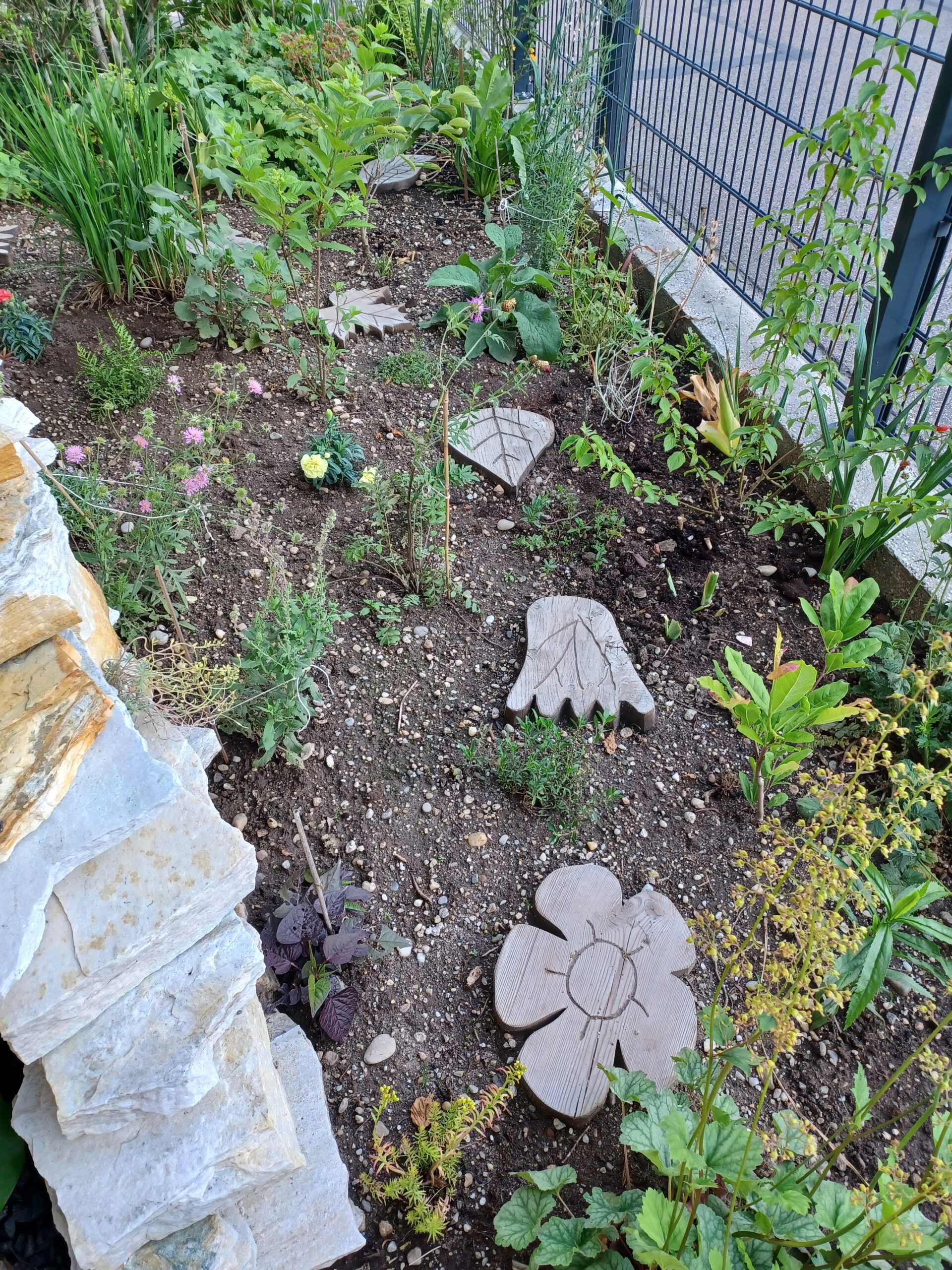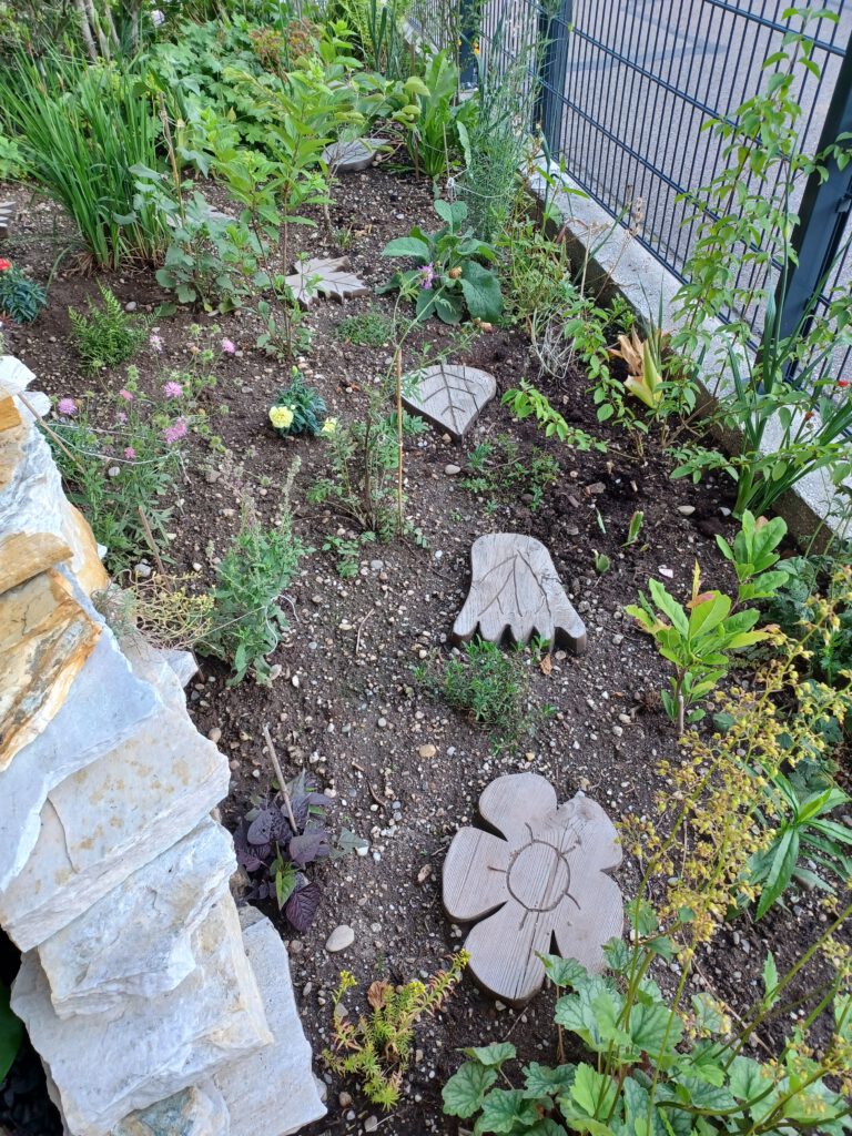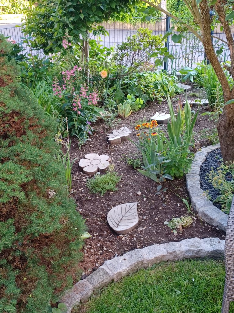 Alle Trittsteine sind circa 5 – 6 cm dick und so groß, dass mein Mann und ich bequem darauf laufen können. Wir haben sie zu dreiviertel in den Boden eingegraben und einen Weg durch das komplette Beet gelegt.
