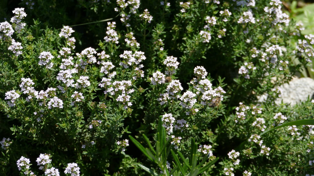 Kräuter gibt es jede Menge. Bei mir wachsen verschiedene Arten Minze, Zitronenmelisse, Rosmarin, Waldmeister, Thymian, Oregano, Basilikum, Salbei, Petersilie, Schnittlauch und Bohnenkraut.