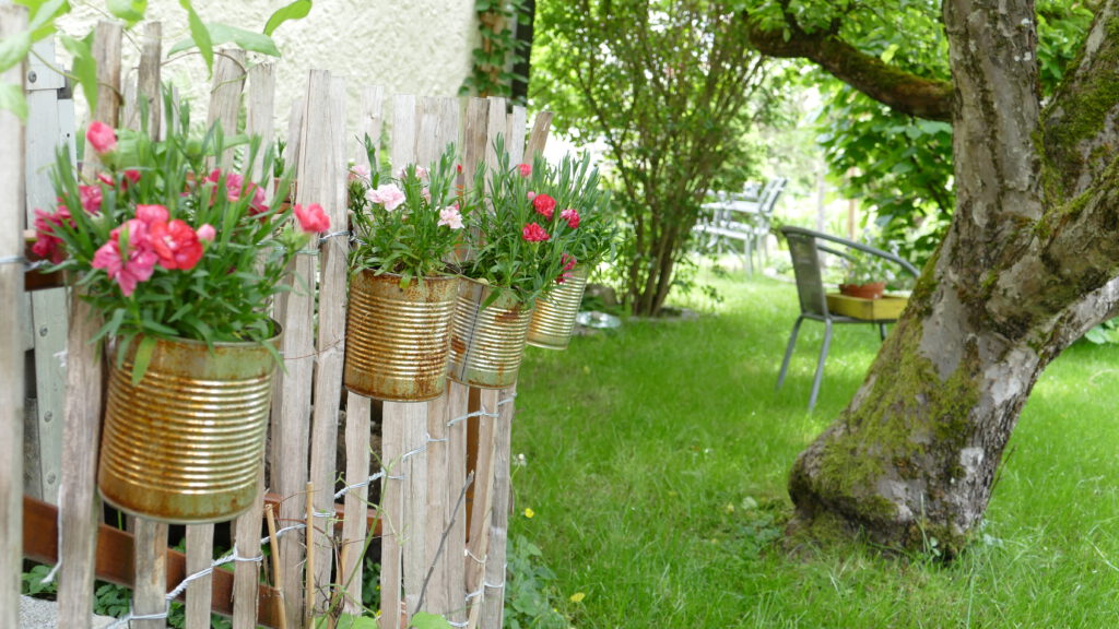 Ich habe zum Beispiel größere Blechdosen mit Abzugslöchern und einer Aufhängung versehen. Diese bepflanze ich je nach Jahreszeit mit Hornveilchen, Geranien oder Nelken. Auch sehr schön.