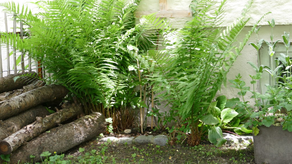 Teile des Stamms und dickere Äste haben wir aufgestapelt und bieten damit verschiedenen Lebewesen einen Lebensraum. Das Laub vom Apfelbaum wird im Herbst hier auch nicht peinlich genau weggeräumt, sondern im Bereich des Totholzes einfach liegengelassen für Igel, Kröte und Co.