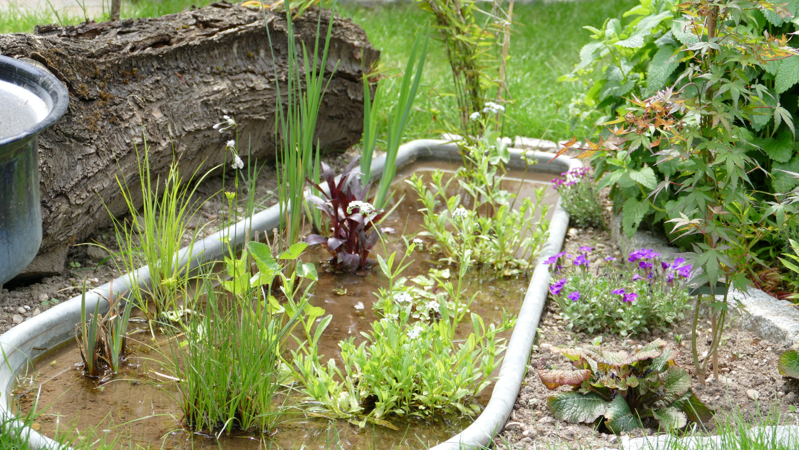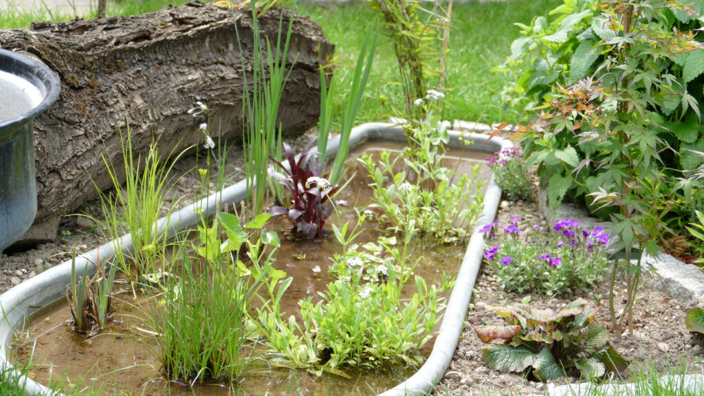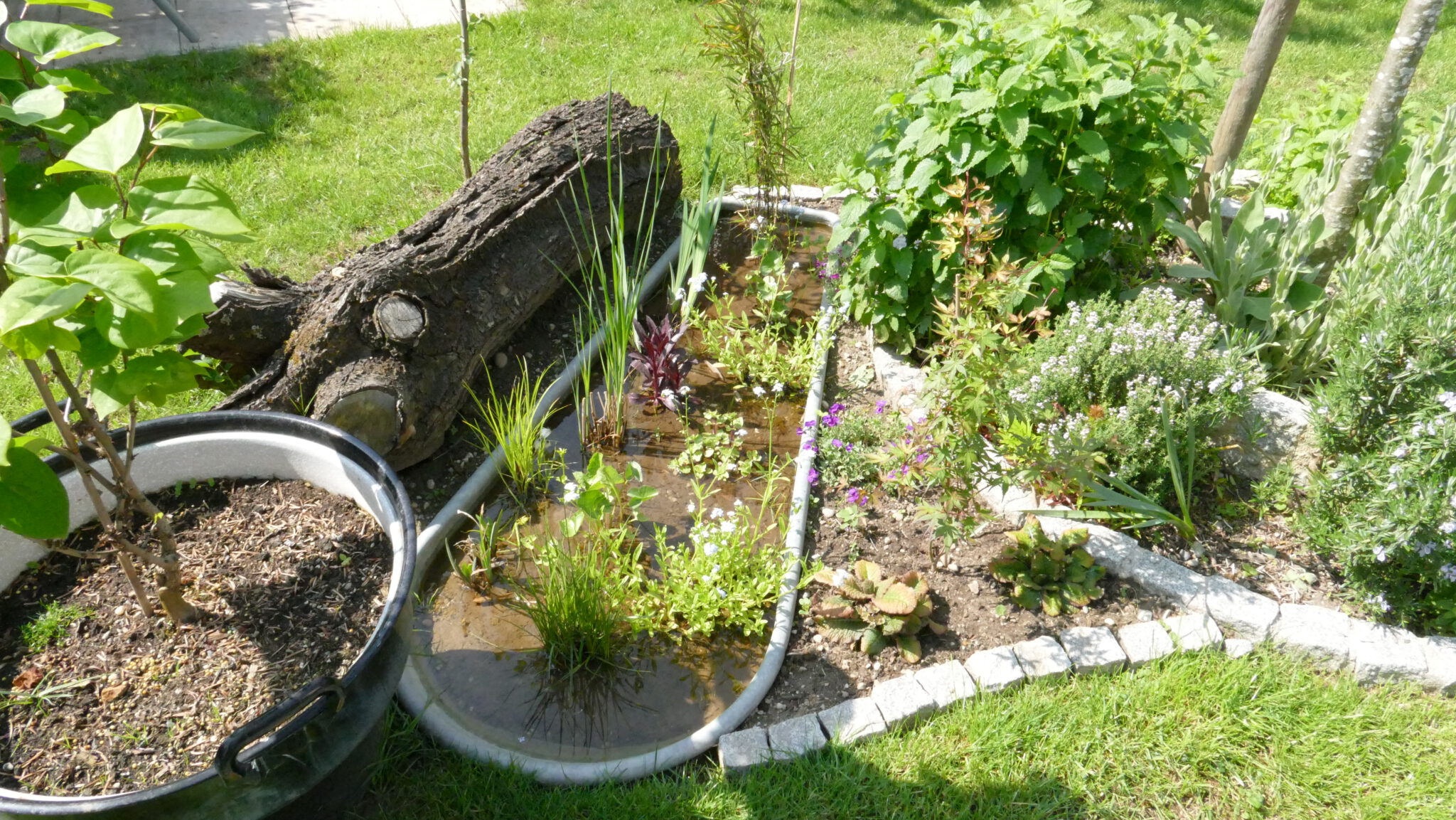 Mein Beet hat einen sonnig bis halbschattigen Platz und darum muss ich aufpassen, dass die Sonne das Beet nicht für längere Zeit austrocknet. Sollte der Wasserspiegel sinken, muss natürlich Wasser zugeführt werden, damit die Pflanzen rundum zufrieden sind. Bei starkem Regen kann das Wasser einfach in die umliegende Rasenfläche abfließen. Die ersten Tierchen haben sich auch schon angesiedelt!