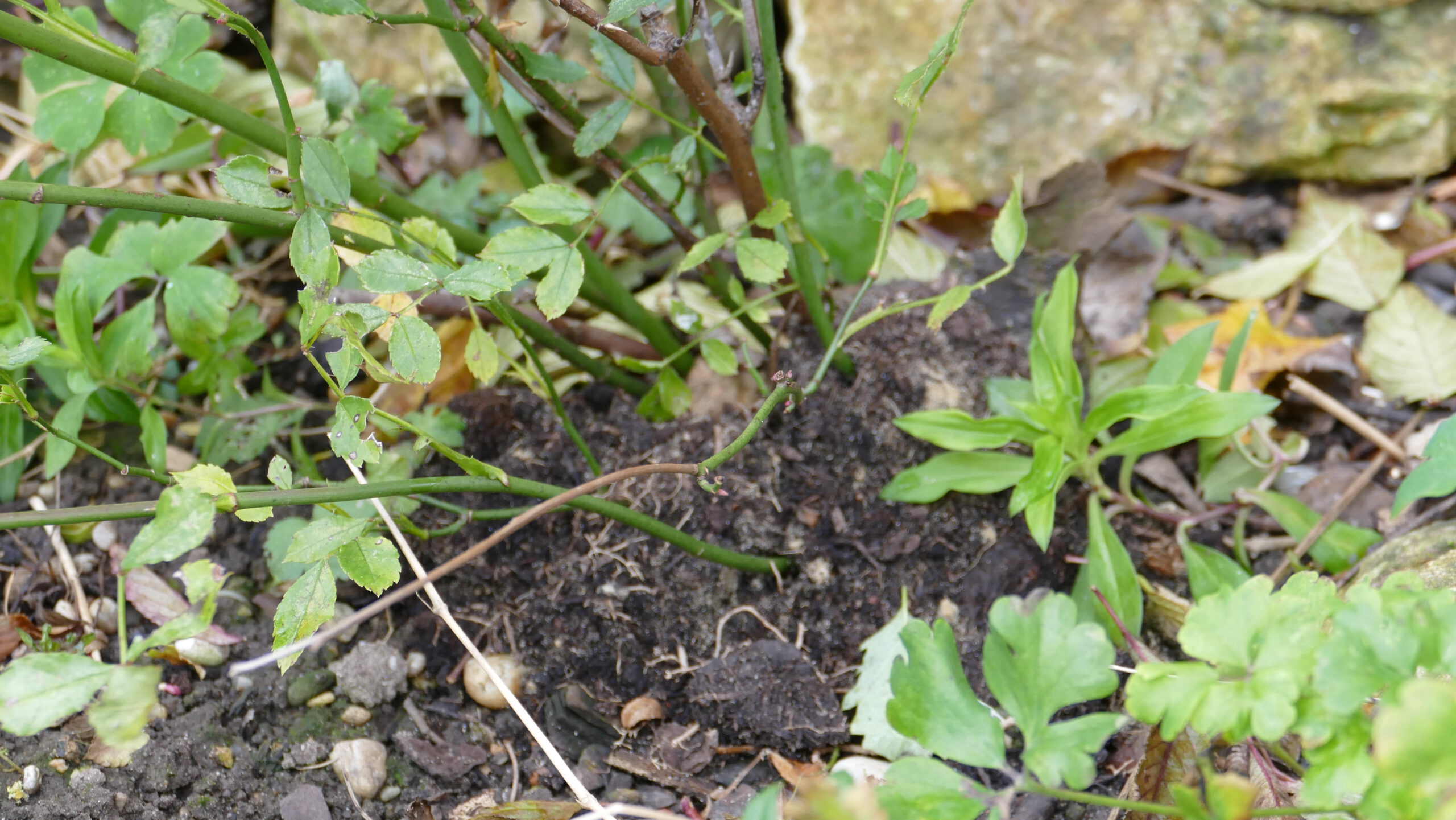 Ganz dringend sind die Rosen anzuhäufeln. Das heißt: bis über die Veredelungsstelle sollte Erde (circa 10 cm) über den Wurzelstock der Rose angehäufelt werden, damit die Rose keine Frostschäden über den Winter erleidet. Ich mache das jedes Jahr bei allen meinen Rosen, egal, ob alt oder jung.